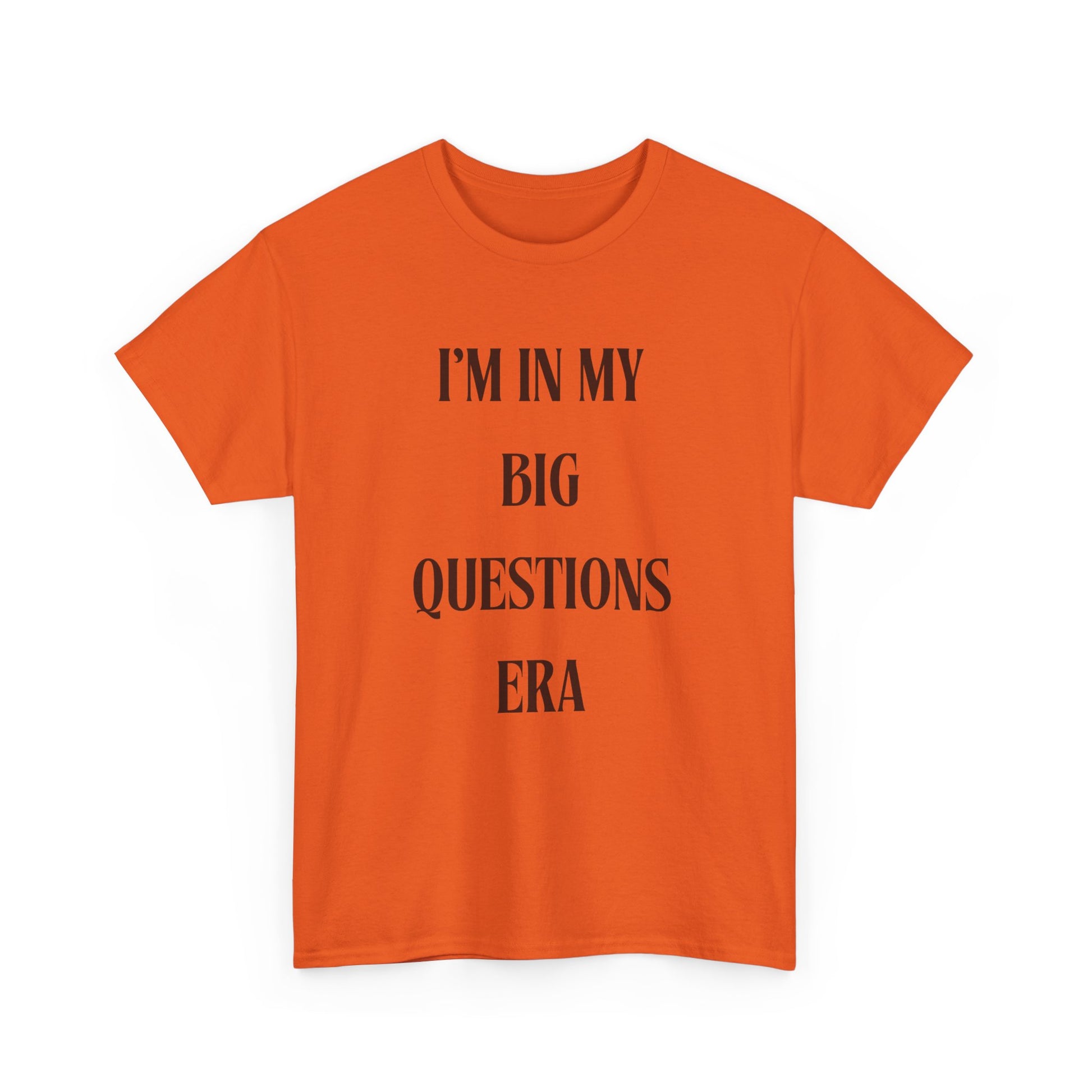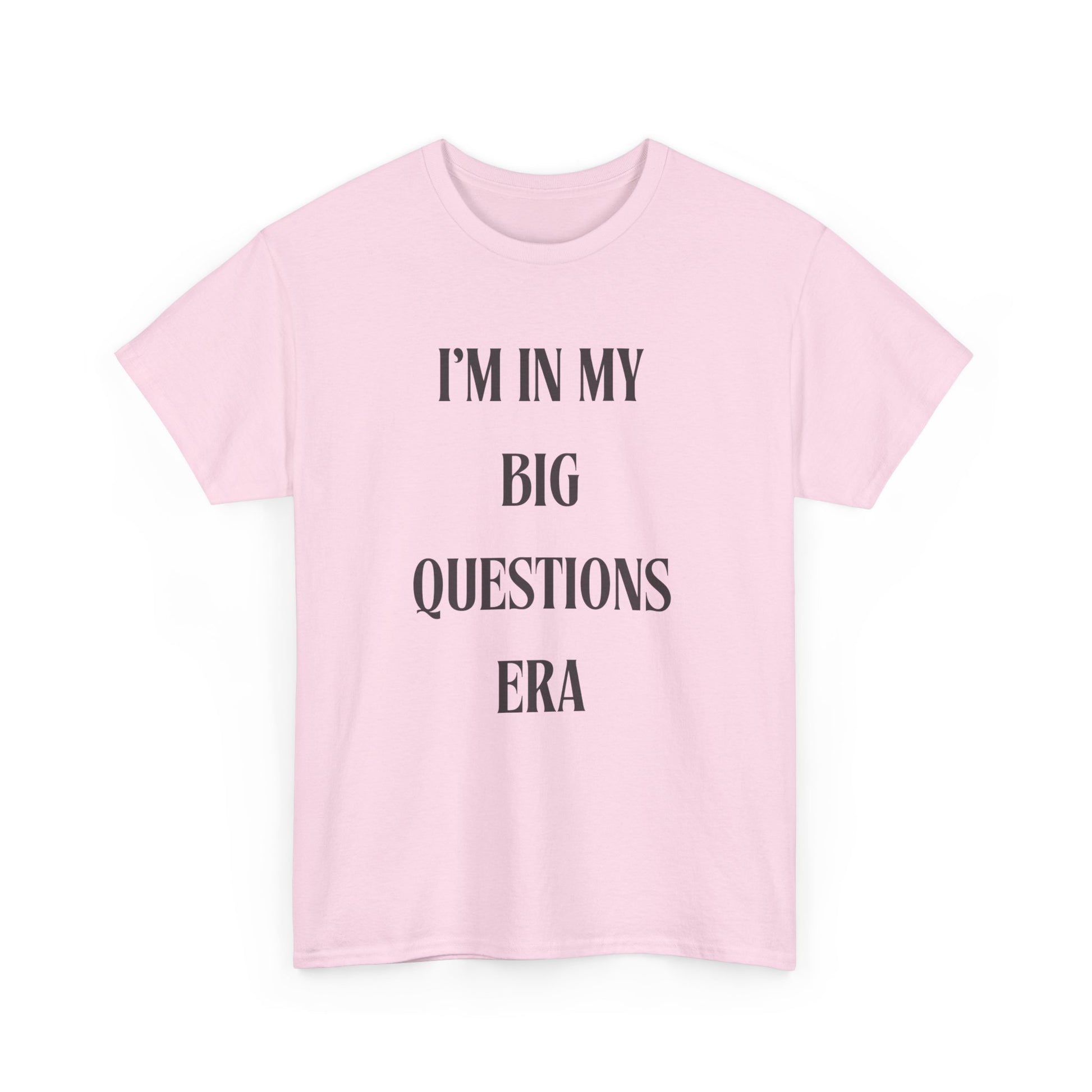 Introducing the ultimate Unisex Heavy Cotton Tee that effortlessly blends comfort and style. This t-shirt is not just a piece of clothing; it's a statement, perfect for anyone in a reflective phase of life. The phrase 'I'M IN MY BIG QUESTIONS ERA' resonates with those exploring their thoughts, making it ideal for deep thinkers, students, and anyone on a journey of self-discovery. Versatile enough for casual outings, social gatherings, or a cozy day at home, it fits seamlessly into any wardrobe. Great for gifting during holidays, birthdays, or any celebration that embraces curiosity and growth, this tee brings a thoughtful vibe to any occasion.